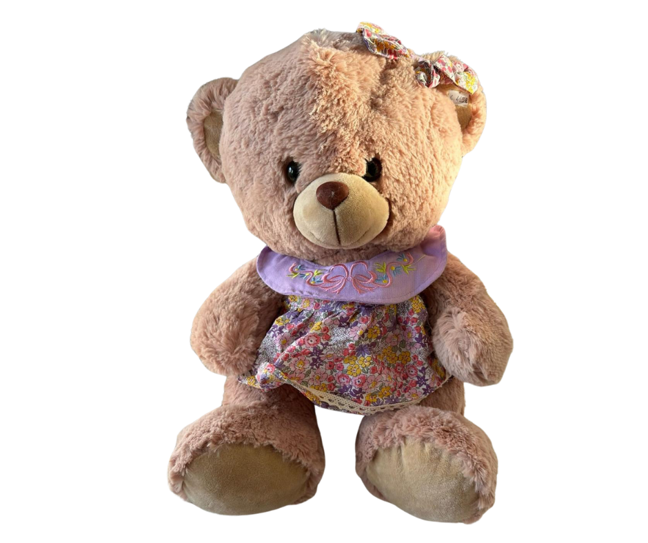 Denne skjønne bamsen kommer kledd i en fargerik blomstrete kjole og har en lilla krage med delikat broderi. En matchende sløyfe i øret setter prikken over i-en! Perfekt gave til barn eller som et koselig innslag i hjemmet.