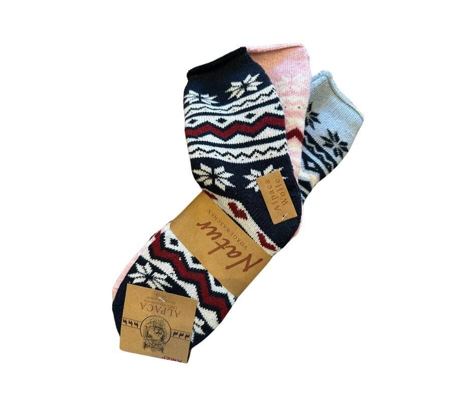 Myke og varme sokker laget av 100 % alpakkaull – perfekt for kalde dager! Disse sokkene kombinerer tradisjonelt design med luksuriøs varme! Tilgjengelig i mange farger med klassisk vintermønster og reinsdyrmotiv: